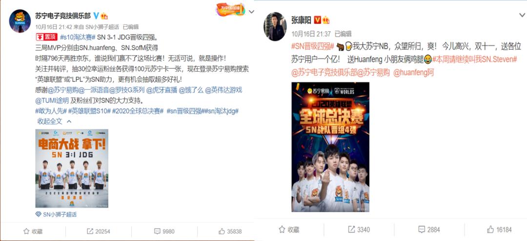 SN赢下比赛后,苏宁易购的评分直线上升,日好评增长数超过150条,是平时的近十倍。副总裁张康阳亲自为其呐喊助威,硬是用“送苏宁用户一个亿”完成了一次完美的事件营销。