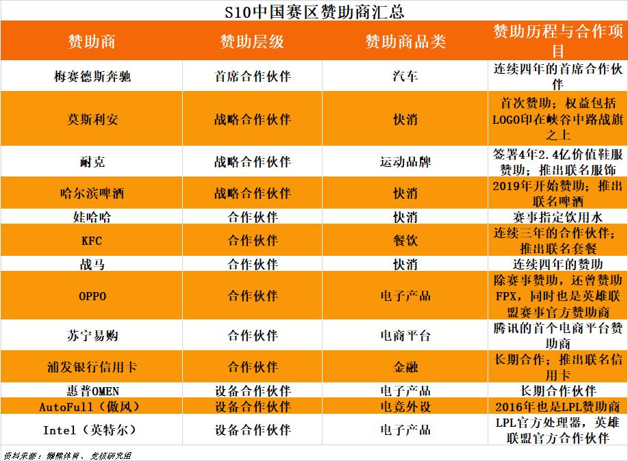 S7赞助商包括奔驰、欧莱雅男士、英特尔、伊利谷粒多、战马、耐克、罗技等等。S8变化不大,S9则再次加入了OPPO、肯德基KI上校、浦发信用卡等。S10又加入了光明莫斯利安、娃哈哈、苏宁等。