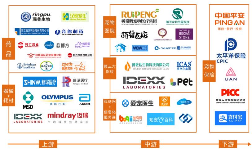 首先来看产业链的分布。宠物医疗赛道的上游为药械供应商,中游为服务提供方,下游为支付方。