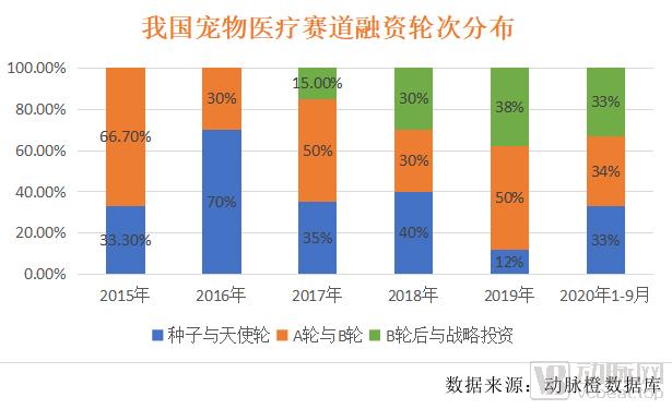 尽管从2018年开始,宠物医疗赛道的融资事件数开始呈逐年下降趋势,但从融资的轮次占比来看,早期项目在逐渐减少,项目阶段不断后移。也就是说,随着作为赛道头部的新瑞鹏等企业逐渐走到上市前夜,宠物医疗行业正日趋成熟,竞争格局似乎也即将落定。