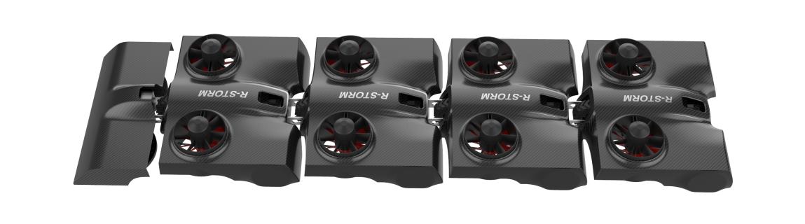 为了更好地跨越障碍物,在形态上R-storm放弃了之前的圆形多足形态,运动能力上仿生了蛇的运动原理,采用了多节的模块化蛇形形态,同时在软件算法层面,R-storm自主研发出自适应跨障算法,机器人可以自主识别不同高度的障碍物,选择合适的跨越路径和方式,目前R-storm机器人可以实现无限制跨越障碍物。