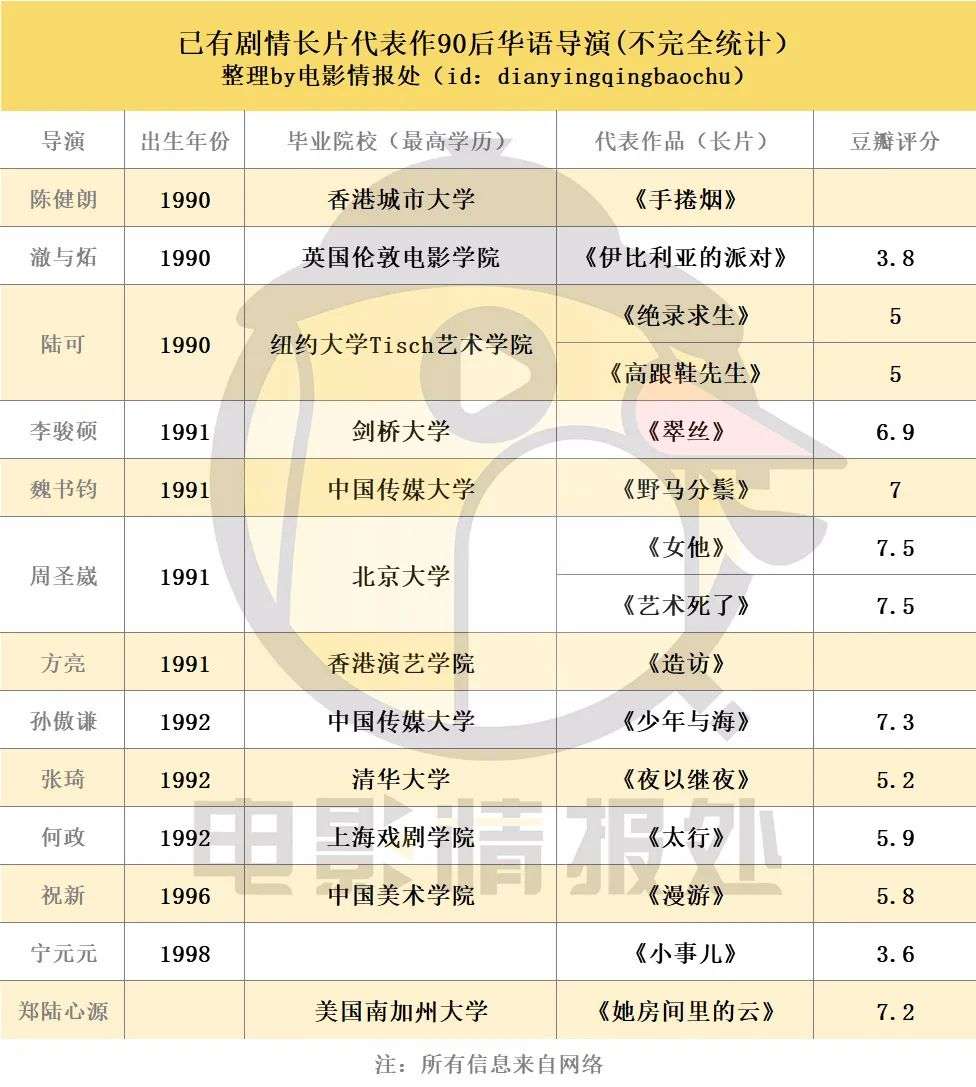 目前来看,投入创作中的90后电影导演数量并不少,但是所擅长的领域,以及代表作品的类型各有不同。情报君仅统计了目前已有完成的剧情长片代表作的部分90后华语电影导演,来看一看大家都交上了一份怎样的答卷。
