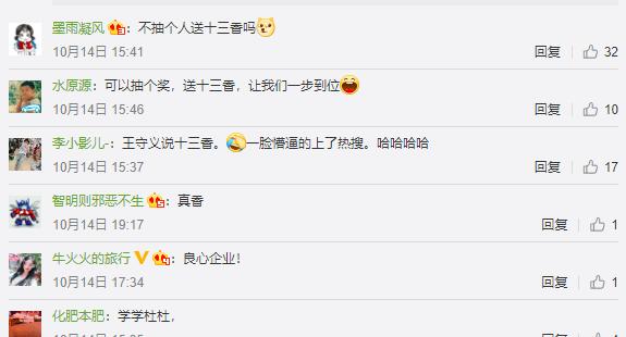在热搜产生的当天,王守义十三香官微迅速发布了产品介绍并上传了宣传视频,并与粉丝互动回应:"12香不香不知道,王守义十三香肯定香,你值得拥有。"