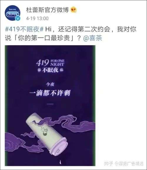 去年4月,杜蕾斯在4月19日 (谐音for one night 一夜情) 发起了一波联动,与喜茶的联动彻底翻车,影响了长期以来积累的正向好感。如果只是为了讨好一部分消费者而让品牌印象游走在刀刃之上,这对品牌来说是不负责的。