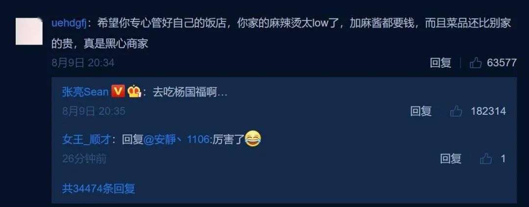 起因是一位网友在艺人张亮的微博下吐槽“张亮麻辣烫”存在加麻酱收费、菜品贵等诸多问题,让他自己专心多管管。结果张亮回复一句“去吃杨国福啊...”,他无意间的一句话让这两家品牌同时上了热搜,这给本就竞争激烈的两家麻辣烫头部品牌更添了很多话题。