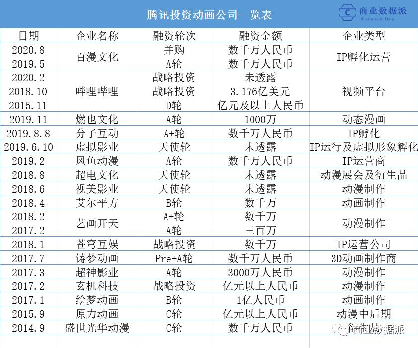 腾讯在扩充IP的同时,也入股了10家左右的动画制作公司。可以看到的是,腾讯的几大头部动漫作品的制作公司,均有接受过腾讯的投资。