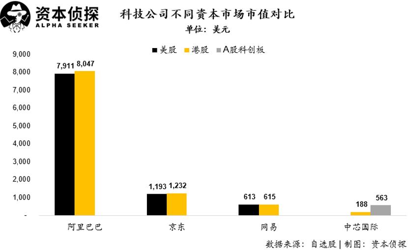不过,同样是在美股及香港两地上市的公司,无论是阿里集团,还是今年回归香港的京东和网易,由于估值体系接近,投资者组成接近,因此并不存在较大的市值差异。