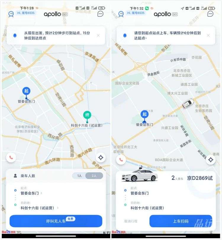 操作方式还有点像是叫滴滴。一位安全员师傅打来电话,“你好阿波罗自动驾驶,请问您叫了阿波罗无人车对吧?”
