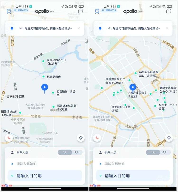 值得一提的是,百度在新闻稿中提及了顺义区域开放了站点,但在地图中并未显示顺义站点。而由于无人车只能在政府限定的测试范围内行驶,所以几个区域之间不能互通,自然是不能从亦庄打车到海淀的。(本来还想在周五下班高峰从亦庄到海淀考验下无人车的耐力......)