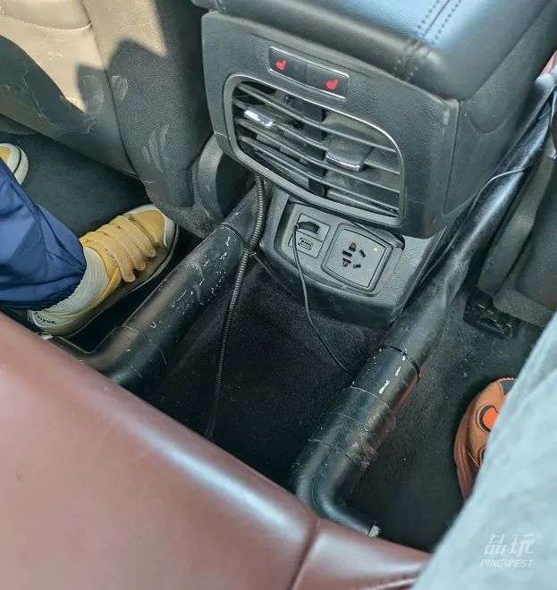 值得注意的是,车内中控附近由空调处穿出两根管道从汽车地板通向通向后备箱,管子内是空调的凉风,它是后备箱的计算单元散热用的。你在车上可以听到呼呼的风扇声。