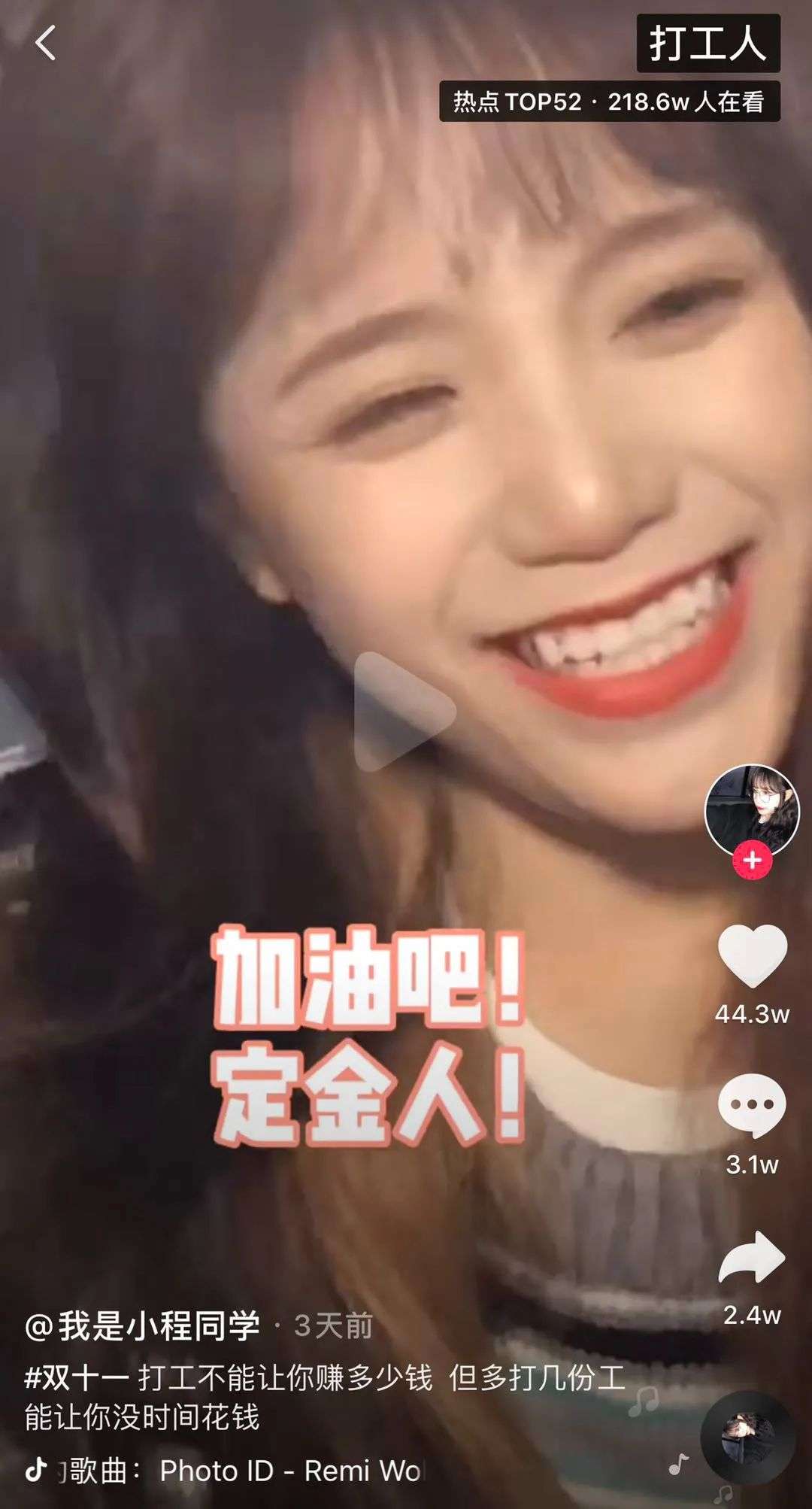 “李佳琦熬夜赚钱,白天可以补觉。你熬夜花钱,白天还得打工。加油吧,定金人!一起冲向美好的未来。”定金人如果不加油,尾款人就只有望货兴叹。不妨告诉大家一个秘密,定金人和尾款人都是一个人!以“打工人”为主干,衍生出的XX人大概都有“杯水车薪”的吐槽意味。