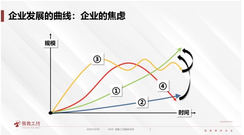看看下面这张企业发展的曲线图,大家都希望自己的企业是第一条曲线,但是,我们看到领教工坊的很多企业尤其是来上特训营的,基本都在第三条曲线上。