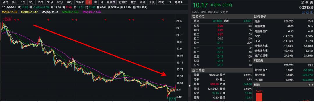 全聚德收入下滑已有三年,2017年至2019年,全聚德营业收入分别为18.61亿元、17.77亿元和15.66亿元,净利润也呈逐年下滑趋势,分别为1.36亿元、0.73亿元和0. 45亿元。这也意味着,全聚德2020年前三个季度就几乎亏光过去三年间的利润。而这三年来股价也一直呈下跌趋势,从最高23.5元/股降至10.17元/股,市值拦腰斩半。