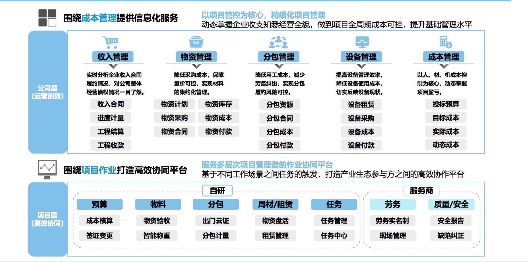 To公司/企业层的「益企工程云」,可以帮助企业实现运营创收的目标,主要是围绕“成本管理”提供信息化服务,其中包括收入管理、物资管理、分包管理、设备管理、成本管理等众多服务。