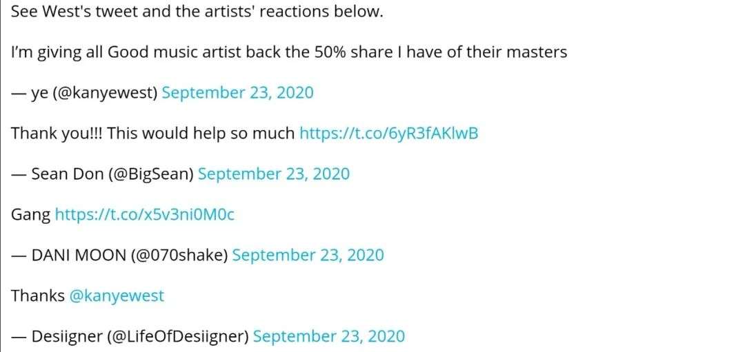 另一方面,由于疫情期间大量演出被取消导致所有艺人收入骤降,越来越多的音乐人开始尤其意识到版税作为稳定收入的重要性。Kanye选择在这个时机发声,或许也正是瞄准此刻同行们对自己主张能够更加感同身受的契机。