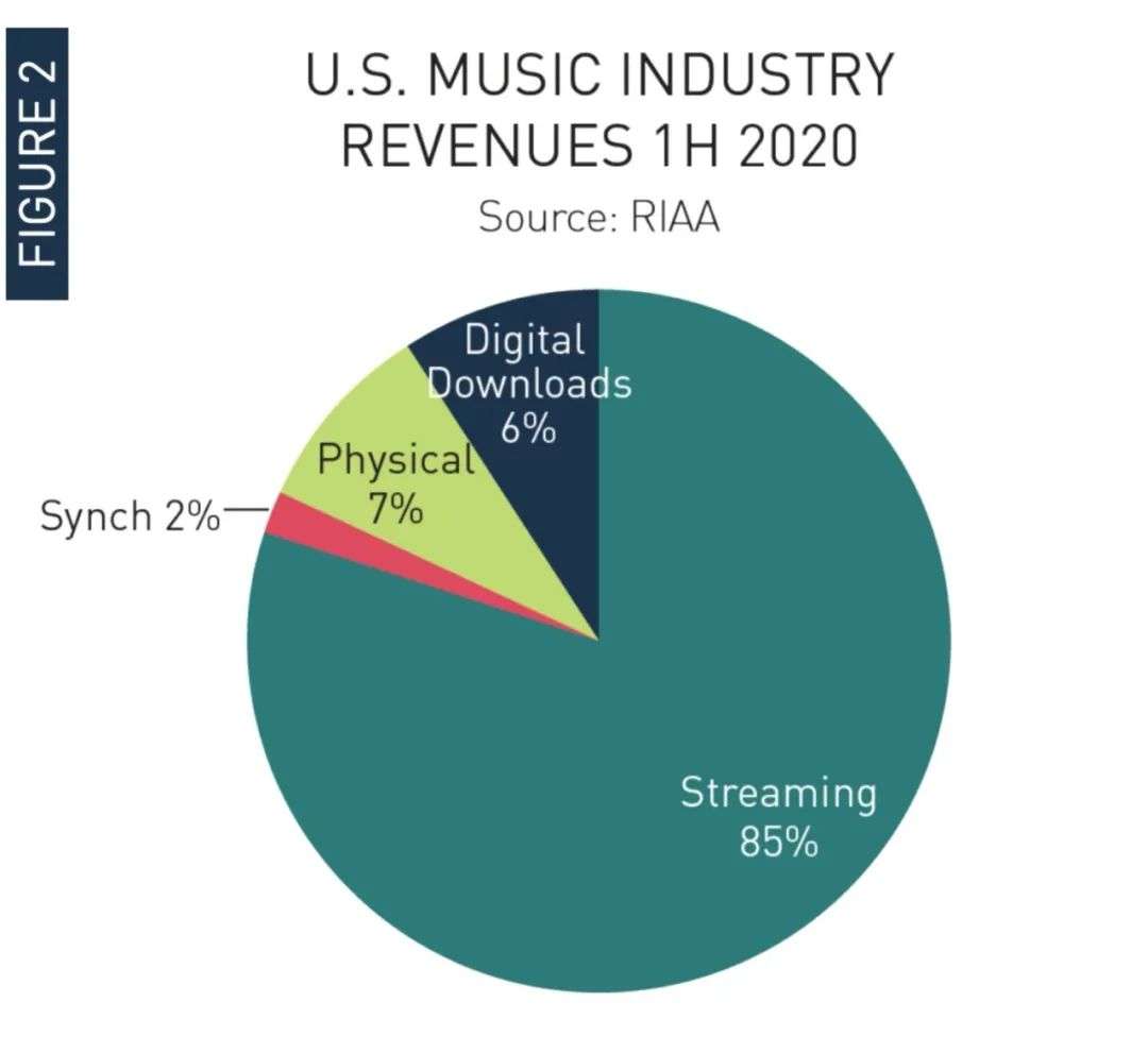 而最后的"人和",则与今年全球新冠疫情息息相关。要知道,疫情肆虐前,世界音乐产业正经历着90年代以来最强劲的增长。美国唱片产业协会(RIAA)去年报告显示,美国的唱片公司以13%连续第四年实现两位数增长,将行业价值提升至111亿美元。即便在过去半年期间,疫情仅仅抑制了部分实体销售,版权收入不减反增。RIAA今年年中报告表明,产业营收同比去年上涨5.1%,其中流媒体收入占比由79%升至85%。