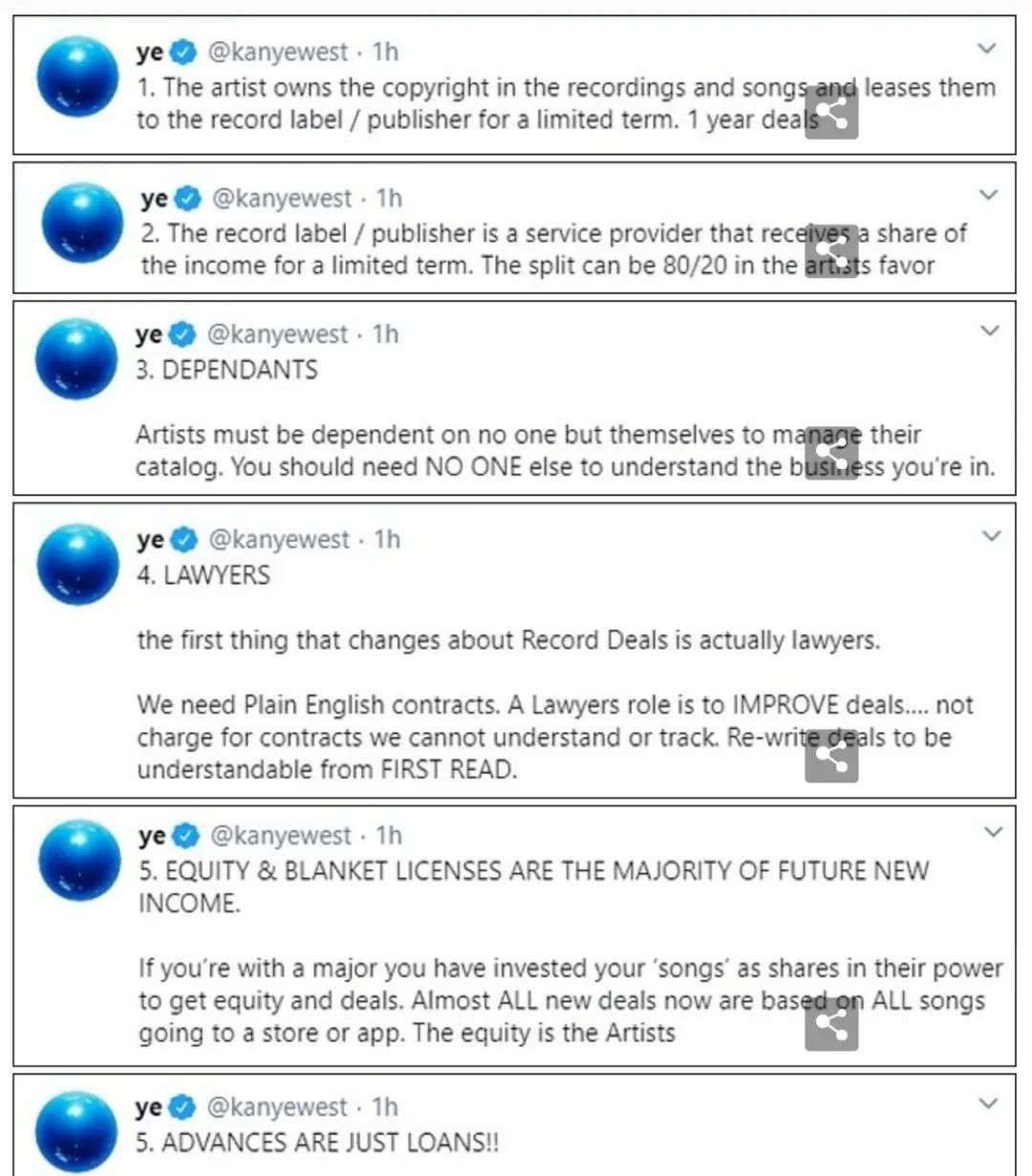 为了纠正这种“不合理”,Kanye于9月20日发布了一份“最新录制发行交易指南”,内容大致可以归结为以下几个方面: