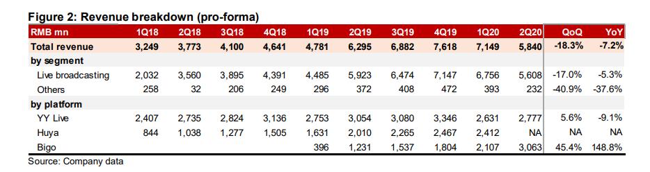 8月14日,欢聚时代发布了该公司截至2020年6月30日的第二季度未经审计财报。前不久,欢聚时代宣布将转让3000万股虎牙B类普通股给腾讯,股票转让交易总价为8.1亿美元现金,此次交易完成后,持股进一步降至17.5%。因而,在本期财报中虎牙已经被剥离出欢聚时代。