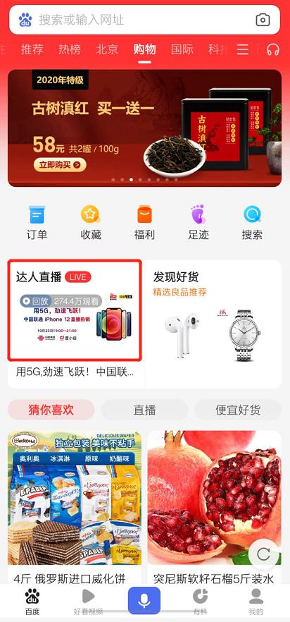 除了知识直播,百度在电商直播和秀场直播上也有发力。10月份,百度App上线了"购物"页面,与淘宝京东功能相似,并有电商直播栏目。