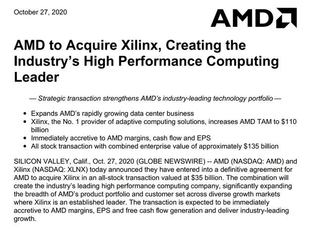 定了!10月27日,AMD和赛灵思正式宣布,已经达成最终协议,AMD 将以350亿美元全股票交易收购赛灵思。注意这里用的「全股票」,没有现金。