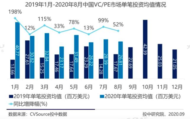 但是,另一方面,今年的单笔投资均值同比都在增长,8月单笔投资均值达2681万美元,同比涨幅52%,其中,亿美元级别交易共计31起,十亿美元级别也有3起。