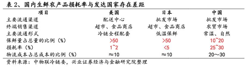 但诡诘的是,尽管供应链环节众多、层层加价,消费者买的价格贵,但商家本身却挣得不多,整个生鲜产业链的利润率也始终不高。其中的关键原因在于损耗,根据兴业证券研报数据显示,国内生鲜产品从产到销,损耗率高达25-30%,保鲜量仅10-20%,而日本损耗率不到5%,美国损耗率仅约1-2%,差距巨大。