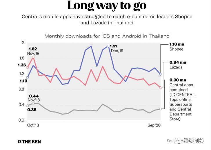 尽管如此,尚泰还有很长的路要走。根据移动应用分析公司Apptopia的数据,10月份,Shopee的电子商务应用的下载次数比尚泰的四个主要应用(JD Central,Tops Online,Supersports和Central Department Store)下载的次数更多。数字化的推动力还超越了技术后端。总部位于泰国的电商公司创始人告诉The Ken,在去年年底,尚泰只有约30%的产品可在线销售。创始人要求匿名,因为他们不想看到别人在公开场合讨论潜在合伙人的业务。同时,尚泰集团也一直在努力巩固其员工文化