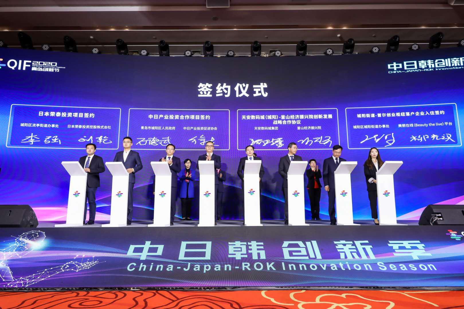 10月29日上午,2020中日韩创新季在青岛城阳正式开幕,中日产业投资合作项目、日本荣泰投资项目、天安数码城-釜山经济振兴院创新发展合作项目等10个项目签约落地,青岛市首个“双城双园”模式离岸孵化器-青岛天安(韩国)科技企业孵化器正式揭牌。