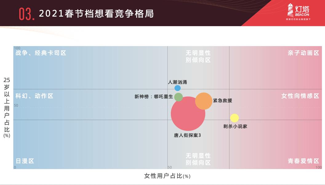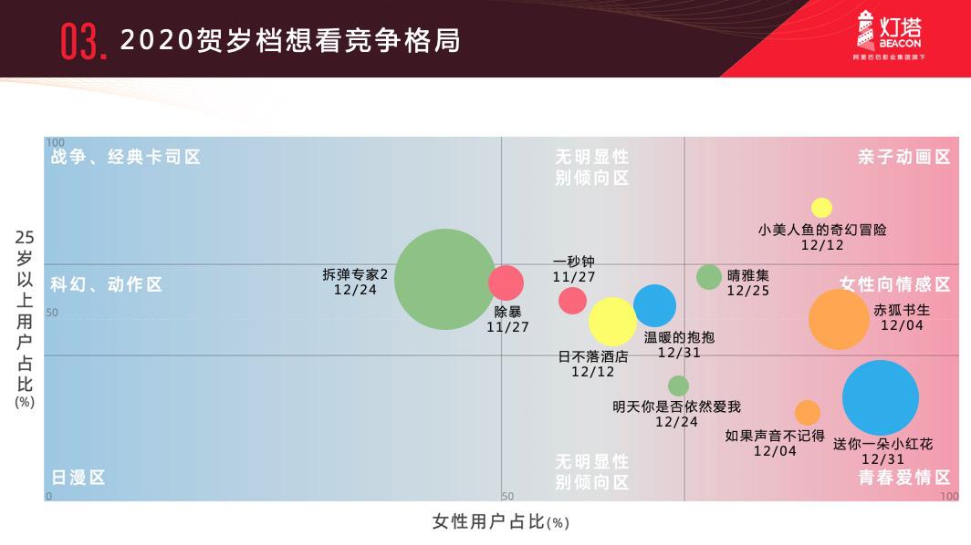灯塔数据显示,目前已定档的贺岁档影片中,热度排名前三的影片里,《拆弹专家2》的观影人群明显偏向于男性;由易烊千玺主演的《一朵小红花》最受25岁以下女性青睐;而由陈立农、李现主演的《赤狐书生》也呈现出明显的女性受众偏好。