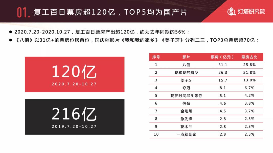 从7月20日电影院正式开门算起,到10月27日为止,中国电影市场复工已经整整100天了。灯塔专业版显示,在这100天的时间里,国内电影市场总票房成绩累计120.32亿,达到去年同期的56%。其中,国庆档8天创造了近40亿的票房,成为仅次于2019年、内地影史第二高的国庆档。