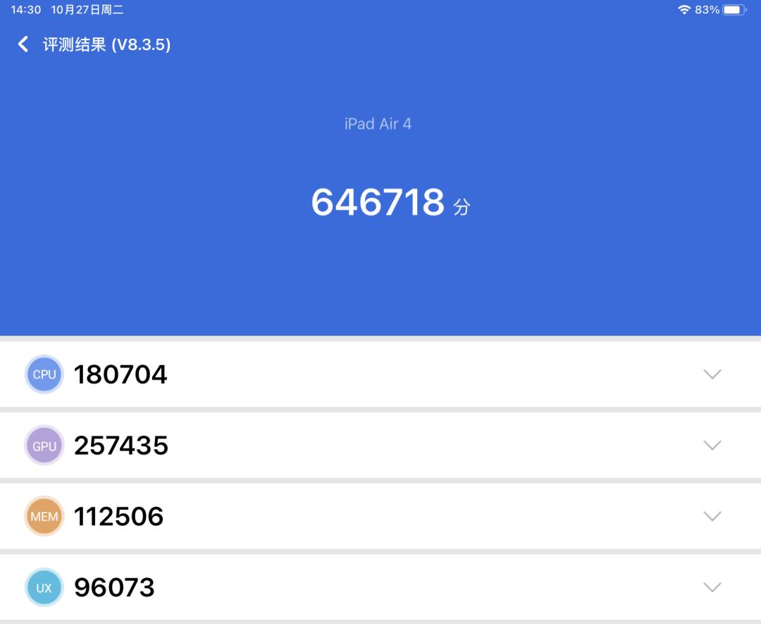 iPad Air 4在安兔兔测试中的表现也是中规中矩,获得了646718分。