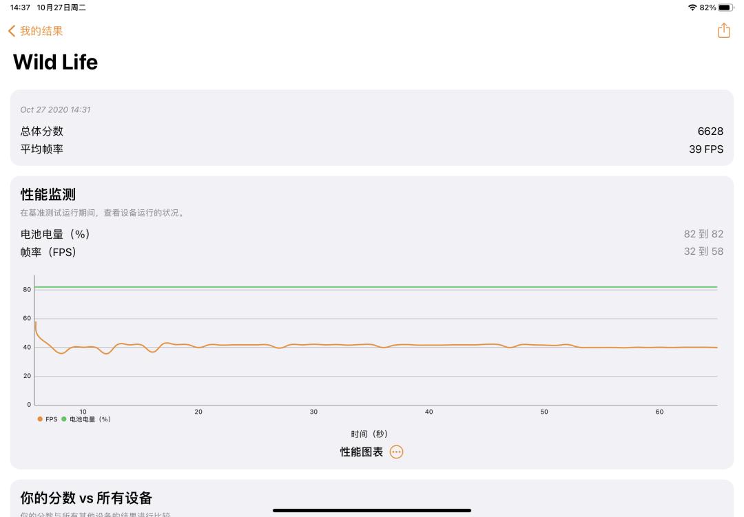 而在最新的3DMark Wild Life基准测试中,iPad Air 4的GPU获得的总分为6628,这个成绩也是相当优秀。