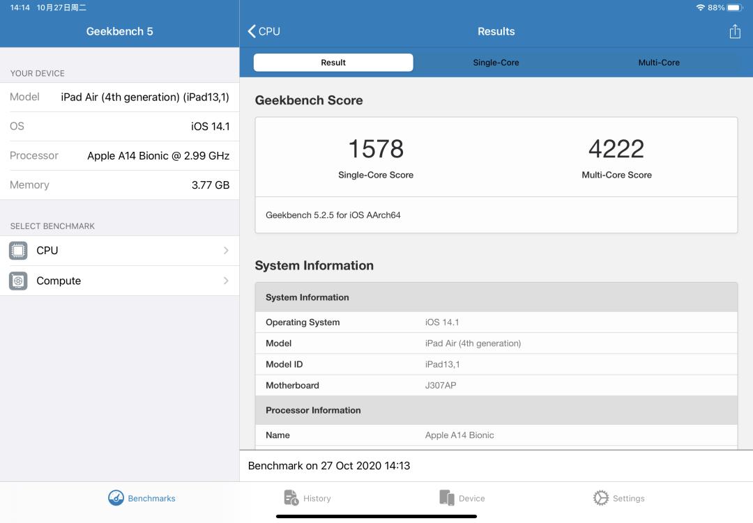 在GeekBench 5跑分中,iPad Air 4的CUP单核成绩为1578,多核4222,而iPad Pro 2020的CPU单核1120,多核4645。由此可见,A14仿生CPU单核要比A12 Z更强,只是多核表现稍差。