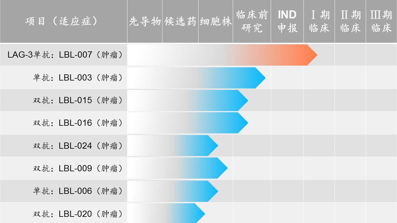 公司目前处于临床阶段的产品LBL-007是一种IgG4亚型全人源单克隆抗体,通过结合人LAG-3蛋白来阻断LAG-3蛋白与其配体的结合,从而解除LAG-3对T细胞的抑制作用,使T细胞恢复免疫功能,起到对肿瘤生长的抑制作用。