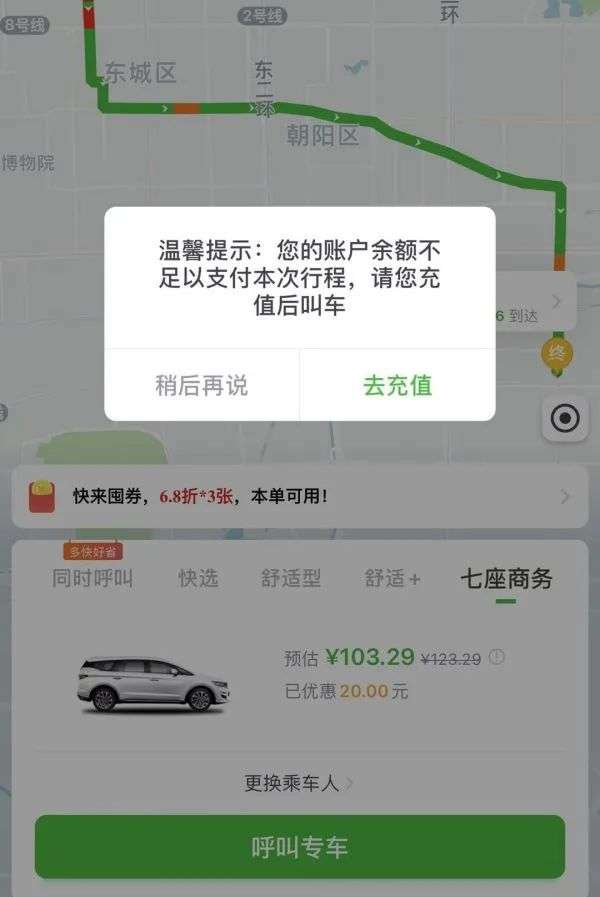 由于此次行程并不赶时间,记者又换了预约叫车,但看到预约单的价格比实时叫车贵了30%左右。就此,上述曹操专车内部人士向记者表示,目前在北京,曹操专车算上自营车辆和加盟车辆大约有2500-3000辆车,车辆数量偏少,所以约车效率会低一些;而关于充值,该人士表示“这是平台的规定”。