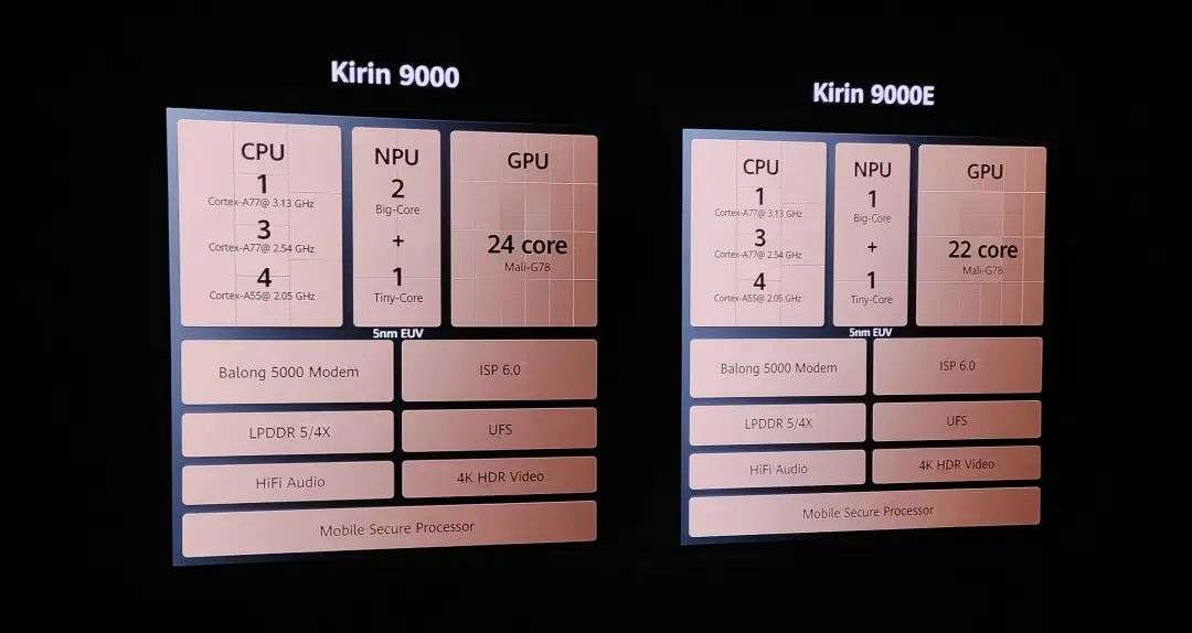 Mate40 搭载的麒麟 9000/9000E 芯片,是全球首款 5nm 工艺制程的 5G 芯片。和同为 5nm 制程的 A14 芯片有所不同,麒麟 9000 系芯片直接将 5G 基带集成到了芯片里,理论上能效比会更强。