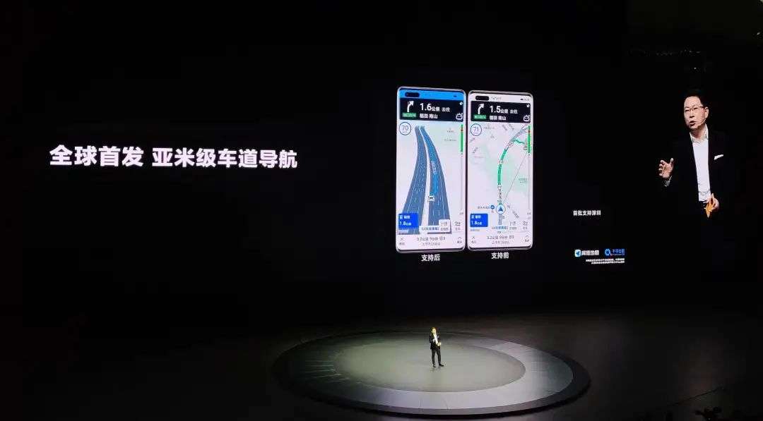 Mate40 系列联合高德地图、千寻位置,首发了亚米级车道导航。目前只有深圳市支持,其他城市在陆续开放中。
