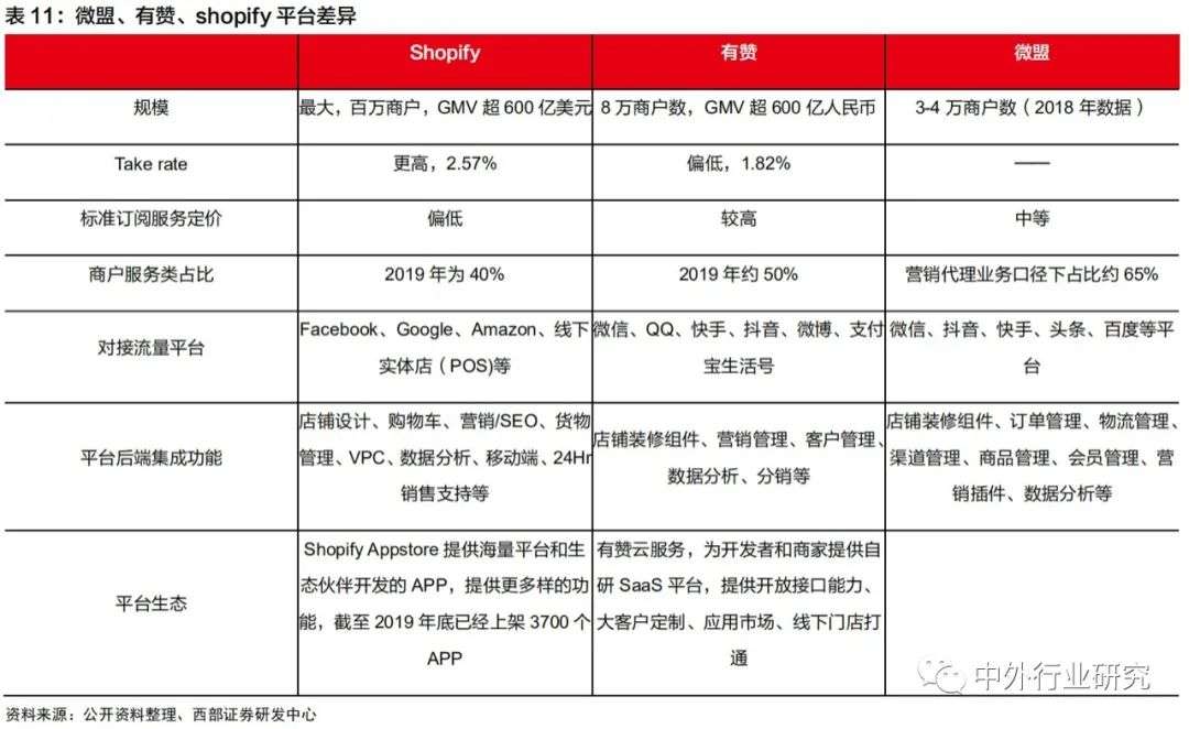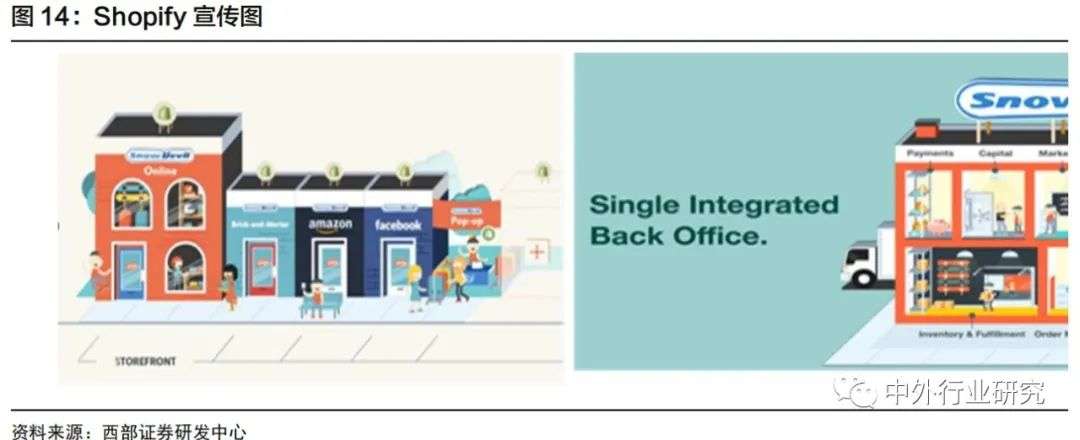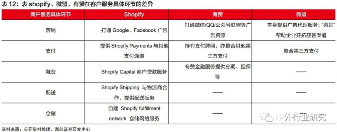 西部证券分析师认为中美电商环境的差异,如中国电商生态之间的封闭性,除微信外几乎所有主要生态都自带第一方电商SaaS 平台,使得中国电商 SaaS 公司基本上只能在微信体系内纵向发展,但基础工具的规模效应可以参考美国 Shopify 公司。