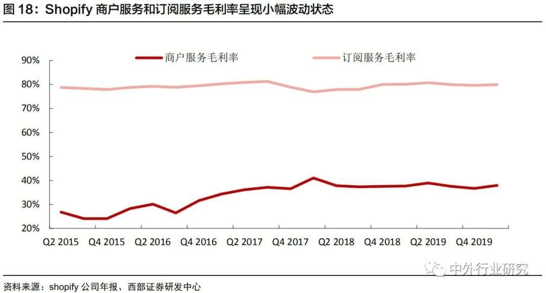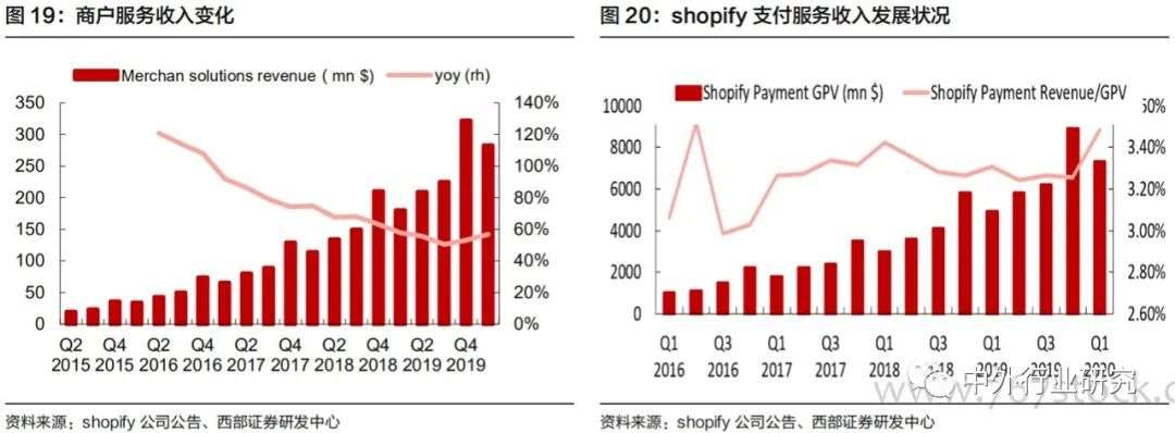 值得注意的是公司订阅服务构成中,除了基础付费套餐收入外,增值服务类(如商户在Shopify 平台购买主题、APP 等)、Shopify Plus 业务收入占比在不断提升,截至 2020 年 Q1,Shopify Plus 和增值服务收费比重分别占 24%和 13%。