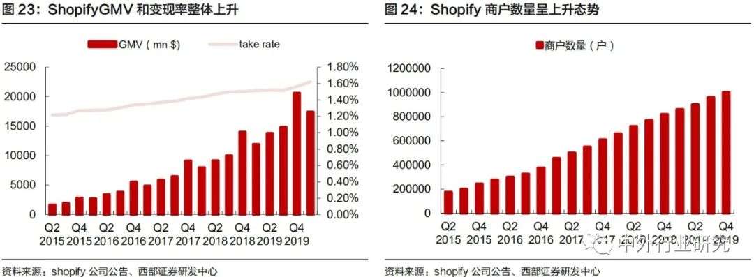Shopify单商户交易规模相对较低,中美同行均持续亏损