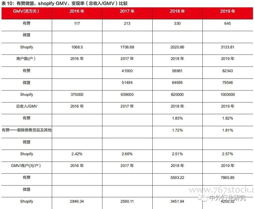 尽管单商户GMV 更低,Shopify 以总收入/商户数计算的 ARPU(总收入/商户数)值与国内同行相比略低,但基本接近,而 take rate(总收入/GMV)则明显更高。