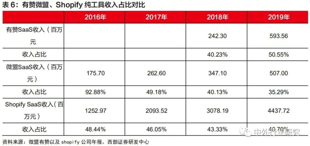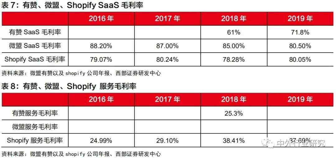 有赞、微盟和Shopify 的SaaS 的毛利率都在 70%以上,可见三者的主要利润来源是来自工具。