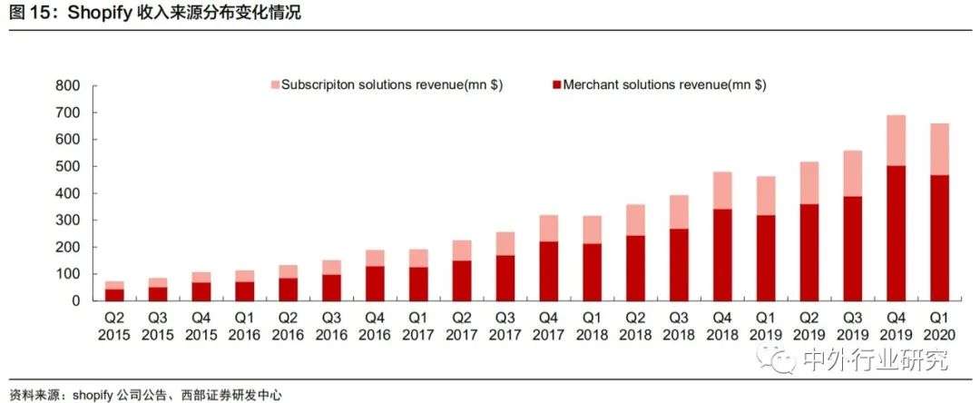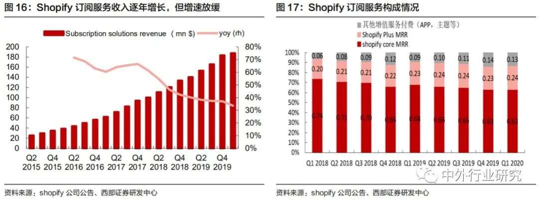 目前shopify 收入来源主要包括会员订阅服务和商户服务解决方案。
