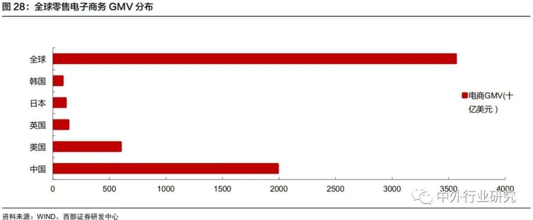 eMarketer 估计,2019 年全球零售电子商务销售额将达到 3.563 万亿美元,中国零售电子商务销售额达到近 2 万亿美元,超过全球总销售额的一半,美国零售电商销售额预计达到 6000 亿美元。从电商市场总规模看,中国远超包括美国在内的其他国家。