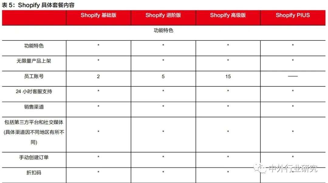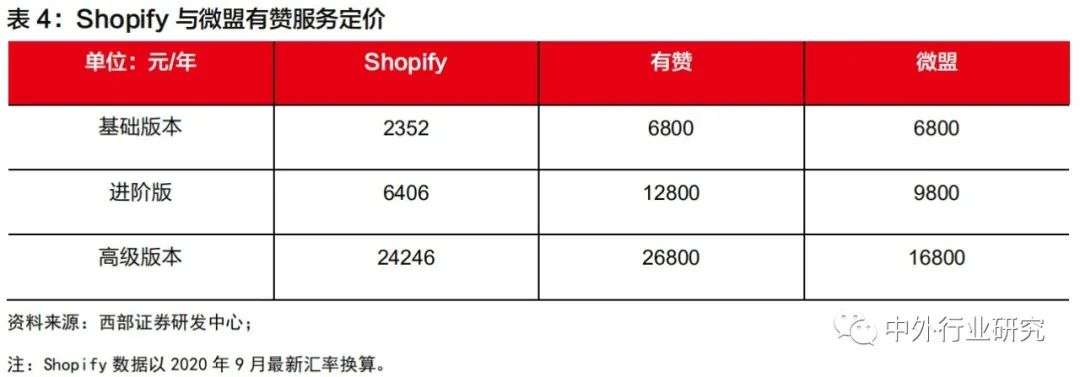 单价比较看,不考虑年费超过2000+美元的 Plus 套餐,Shopify 基础版、进阶版套餐年费总额低于国内同行,其定位品牌客户的高级版本的单价则基本与国内同行相当。