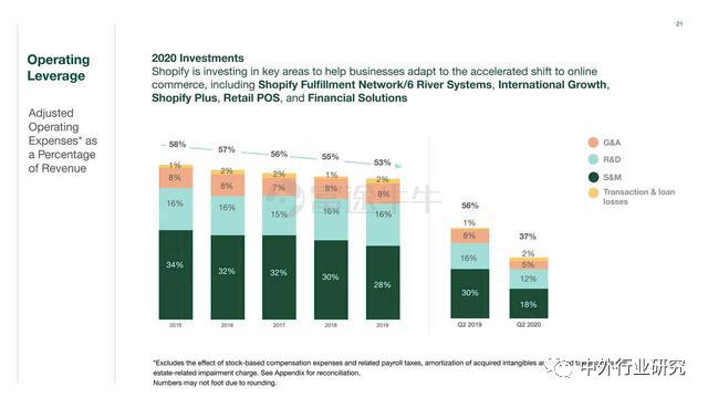Shopify2019 年全年净利润率在-8%,2020 年Q2 由于特殊时期影响下,线下商务拓展和接待无法实现,因此营销费用出现较大幅度下降,由去年同期的30%下降至18%,助力第二季度转亏为盈,利润率达5%。
