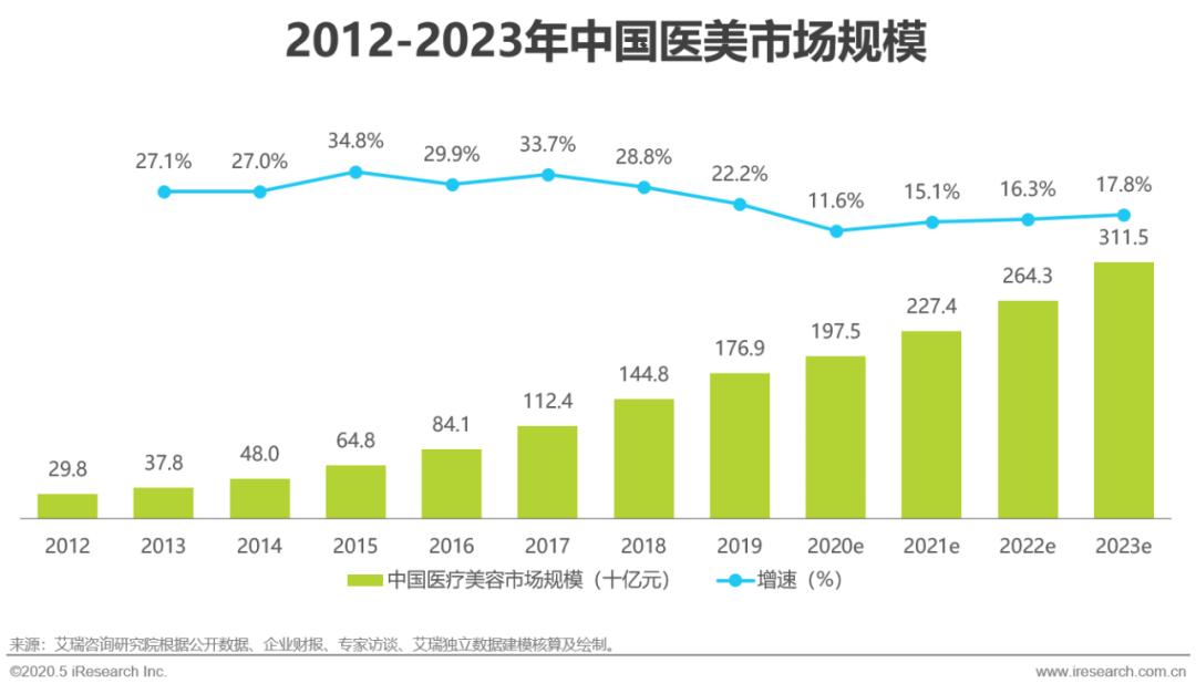 上游厂商、正规医美、黑医美,三者形成了一个畸形的怪圈,而这也给快速发展的医美市场狠狠踩了下刹车。据艾瑞数据显示,医美行业从2013年为起点进入爆发期直至2017年保持了超过30%的年复合增长率,但在去年,医疗美容市场规模增速降至22.2%。