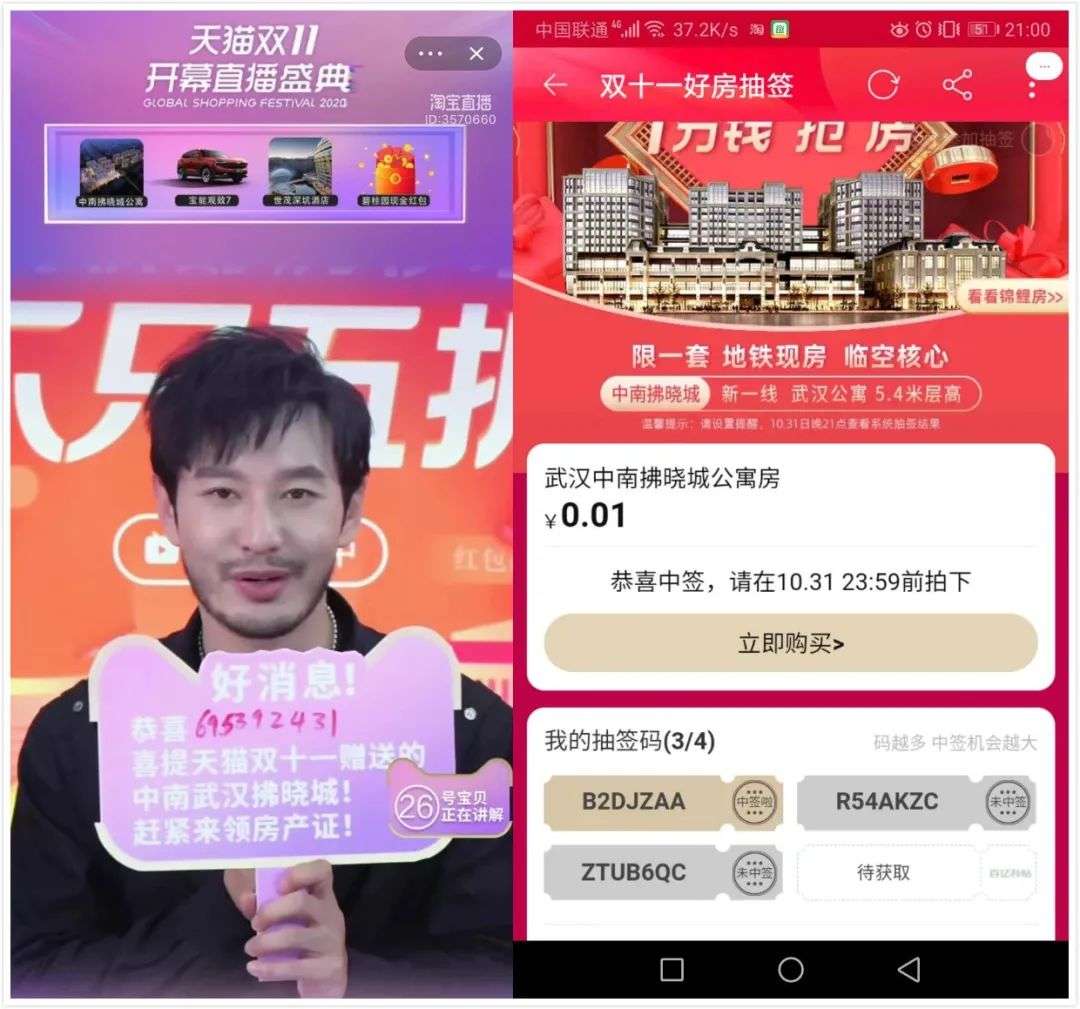 明星在结束舞台秀之后,还会进入到主播的直播间,演出又转移到了小手机的直播间上。马云空降到了汪涵的助农直播间,帮忙吆喝农产品,黄晓明出现在了“天猫好房”的直播间,秒杀送房。来自武汉的淘宝用户“憨憨不憨123”抽中了一套107平方米,价值超70万的房子。根据协议,获奖者获得的是这套房的“终身”使用权。