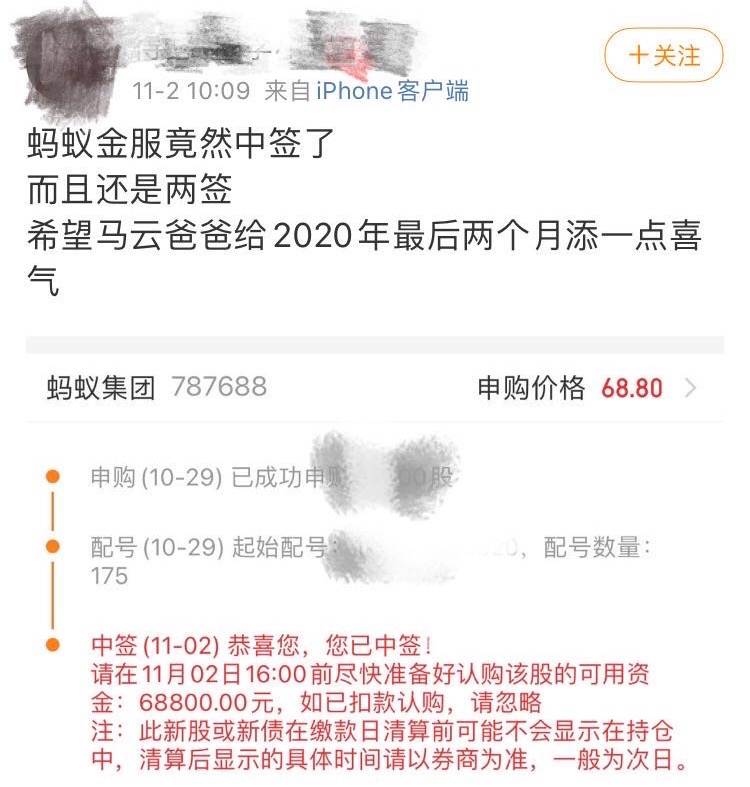 投资者纷纷在社交平台晒出蚂蚁打新成绩单。
