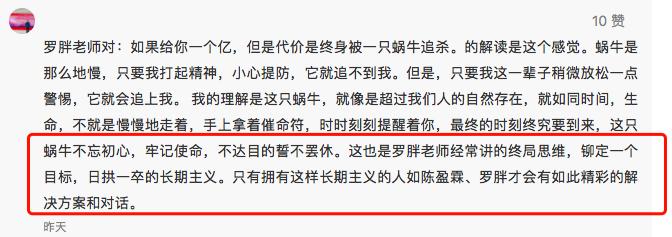 罗振宇明确表示了,“蜗牛是那么地慢,只要我打起精神,小心提防,它就追不到我”。可他也清楚,“只要我这一辈子稍微放松一点警惕,它就会追上我”。